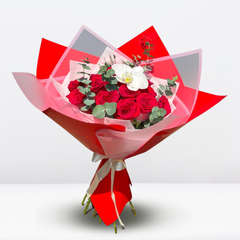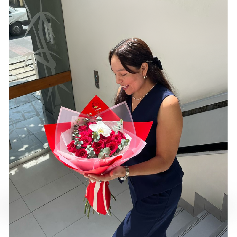 Bello Ramo Exclusivo de 15 Rosas Rojas y una flor de Orquídea, símbolo de amor verdadero y duradero.
