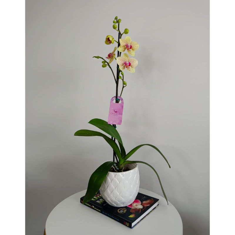 Orquídea Grande Amarilla con Pecas (Pulsation) & Maceta Piña